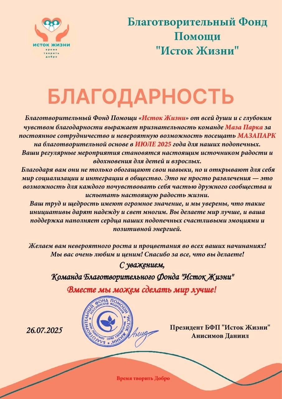 🌟 БФП "Исток Жизни" от всей души выражает огромную благодарность MazaParky за регулярное посещение! 👍 Сегодня мы с радостью провели время в этом замечательном месте! 🔥
